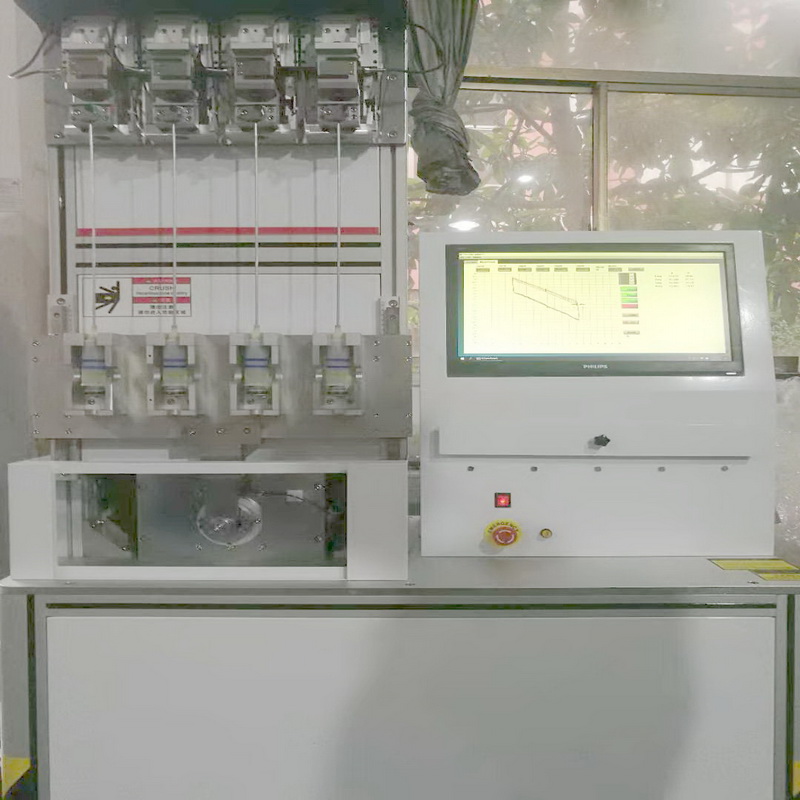 洗衣机吊杆力学疲劳试验机是专门用于测试洗衣机吊杆力学的的检测设备,设备采用PC电脑程序控制, 用高扭矩伺服电机驱动,高采样率数据采集卡采集数据,使之能得到准确稳定的吊杆高速上下运动的时候的力值与形变对应的曲线。本设备采用肆个传感器,可以同时测试肆个产品的力值曲线,大大提高测试效率,是吊杆测力较为理想的寿命测试设备之一。